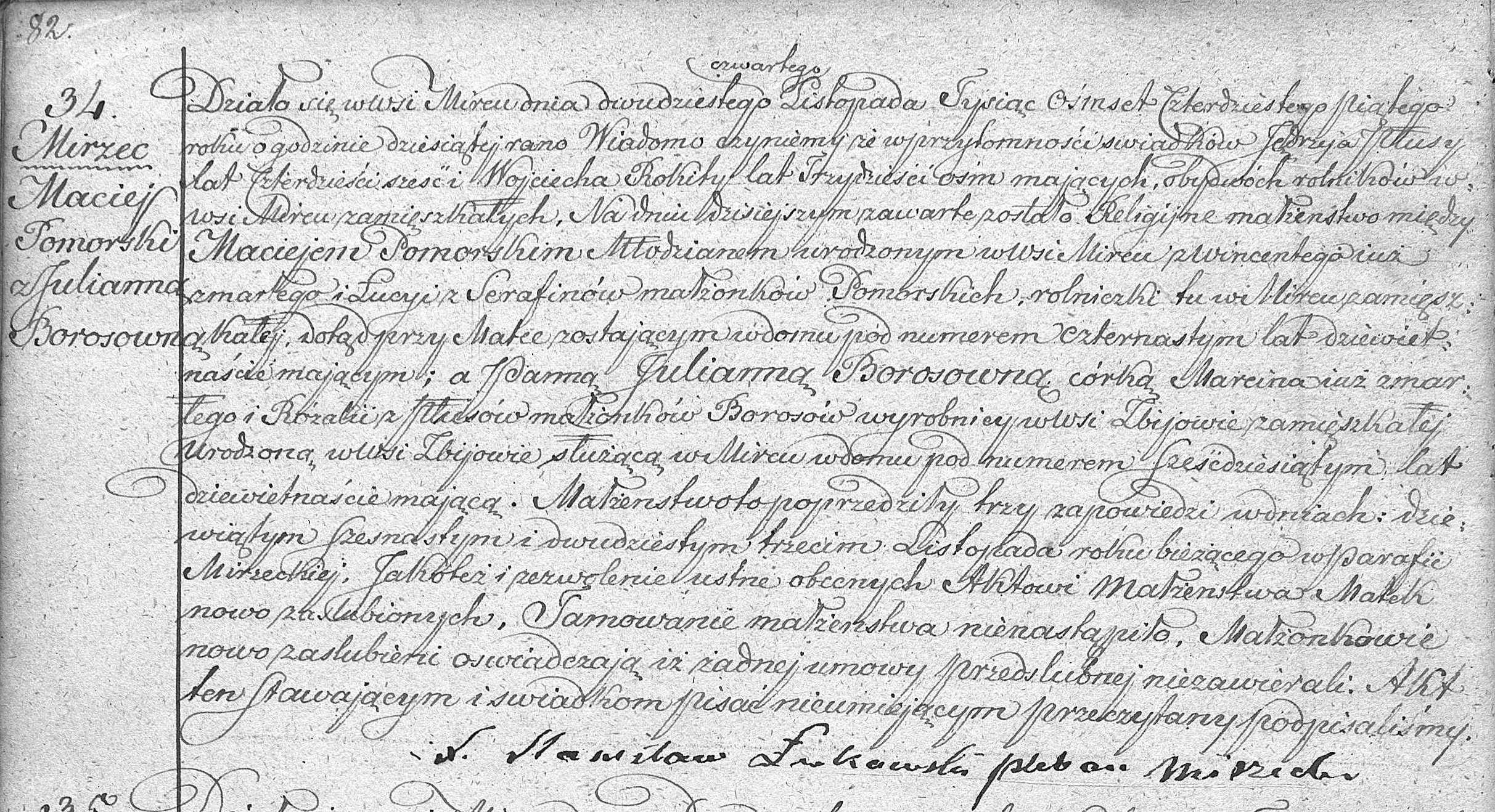 Ślub Macieja Pomorskiego z Julianną Boros (∞ 24.11.1845 PK Mirzec, wpis 34)