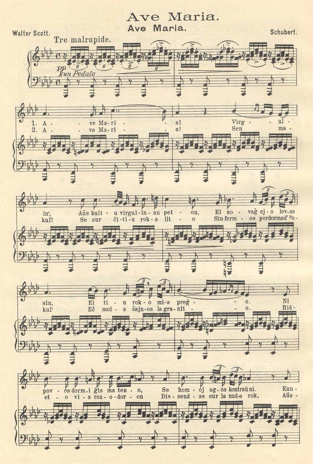 | Ave Maria! Virgulin', Aŭskultu virgulinan peton, El sovaĝejo levas sin El tiu roko mia preĝo. Ni povos dormi ĝis mateno, Se homoj agos kontraŭ ni. Kunsentu kun mi, virgulino, Infanon aŭdu, ho, patrin'! Ave Maria! |
