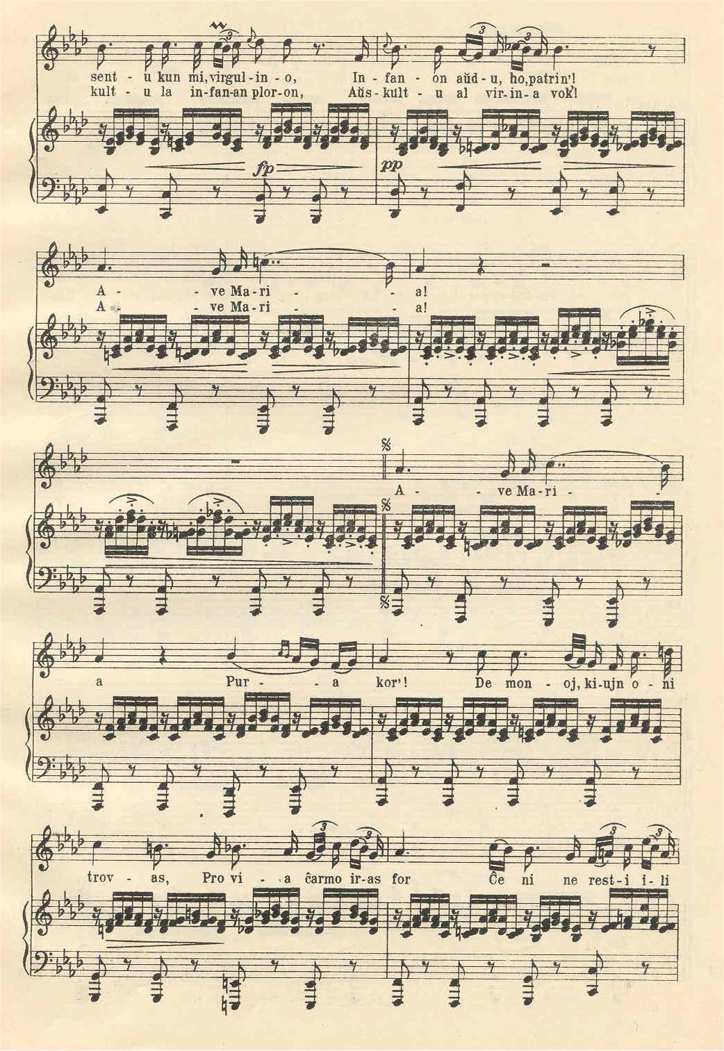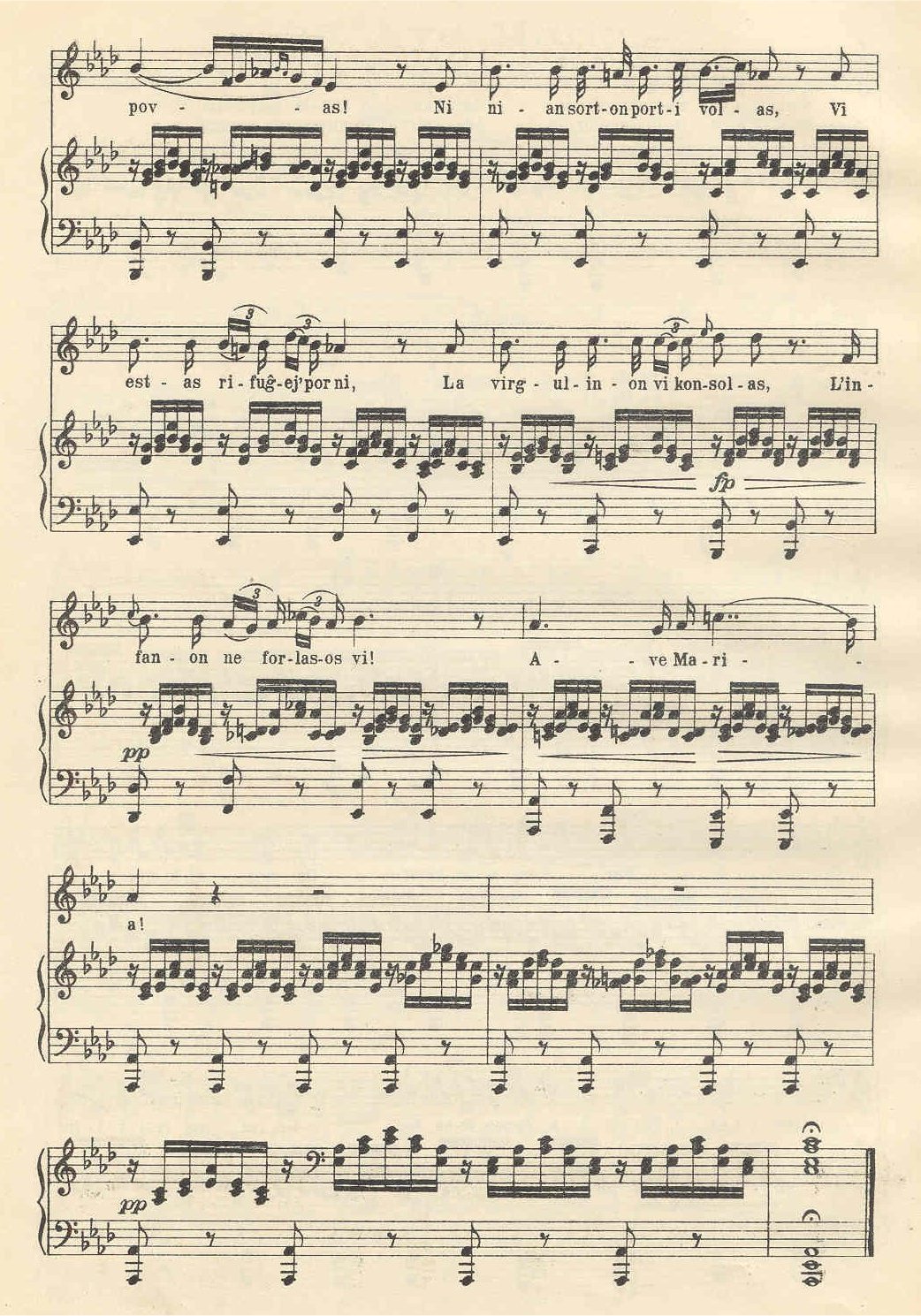 Ave Maria! Pura kor'! Demonoj, kiujn oni trovas, Pro via ĉarmo iras for Ĉe ni ne resti ili povas! Ni nian sorton porti volas, Vi estas rifuĝęj' por ni, La virgulinon vi konsolas, L'infanon ne forlasos vi! Ave Maria! |
