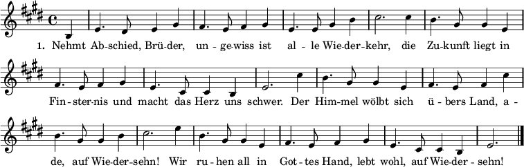 Nehmt Abschied, Brüder, ungewiss ist alle Wiederkehr, die Zukunft liegt in Finsternis und macht das Herz uns schwer. |
